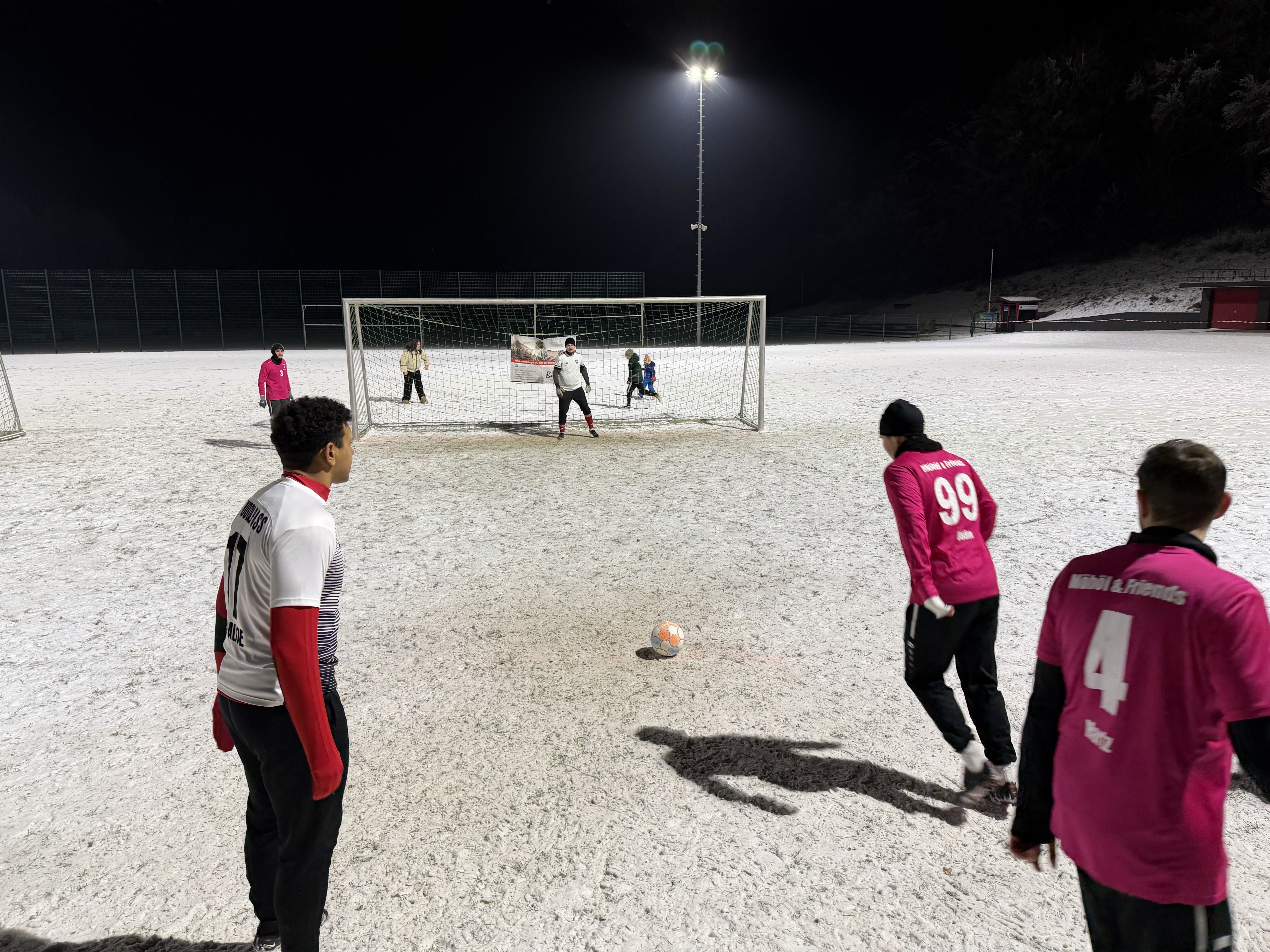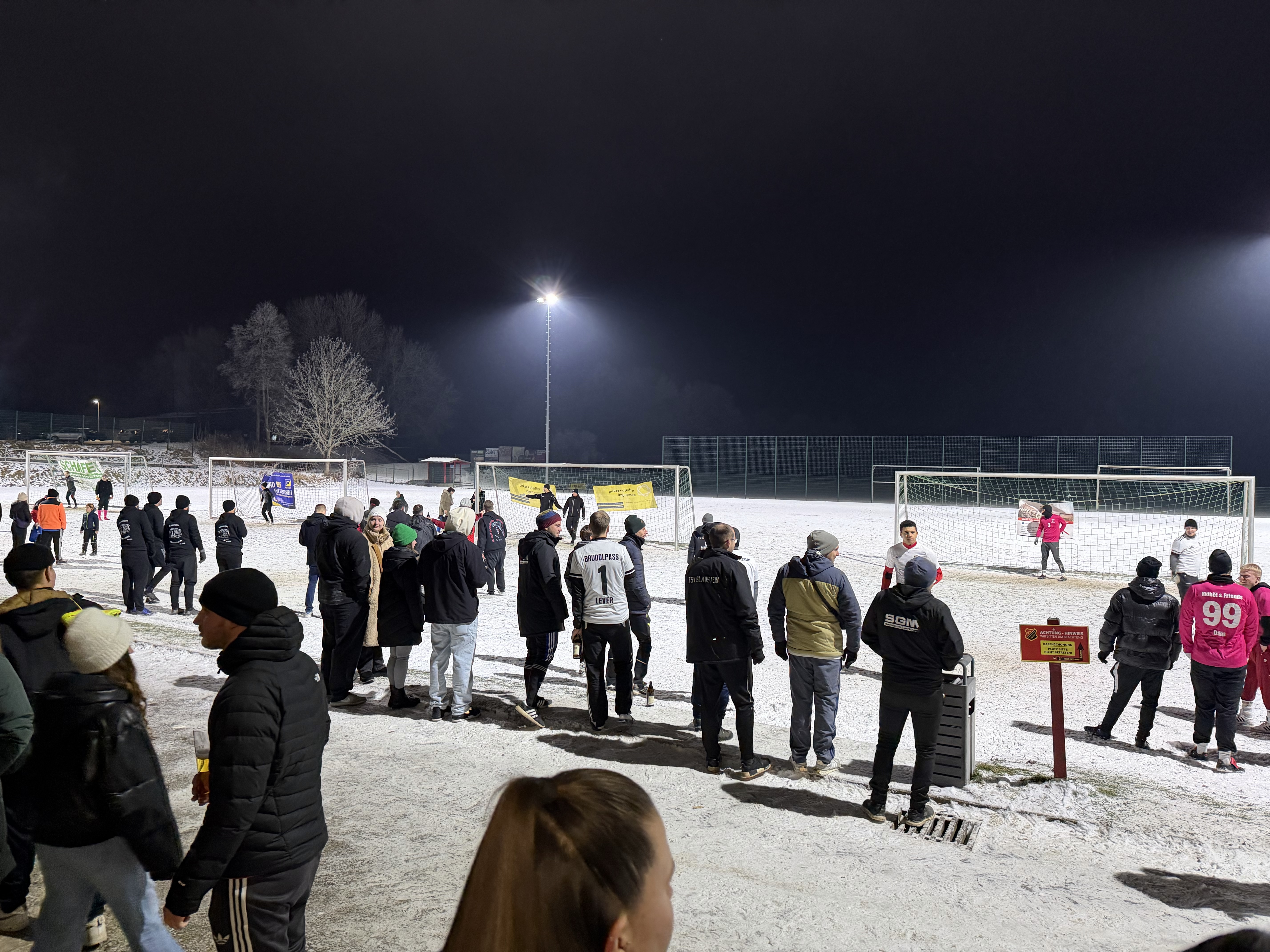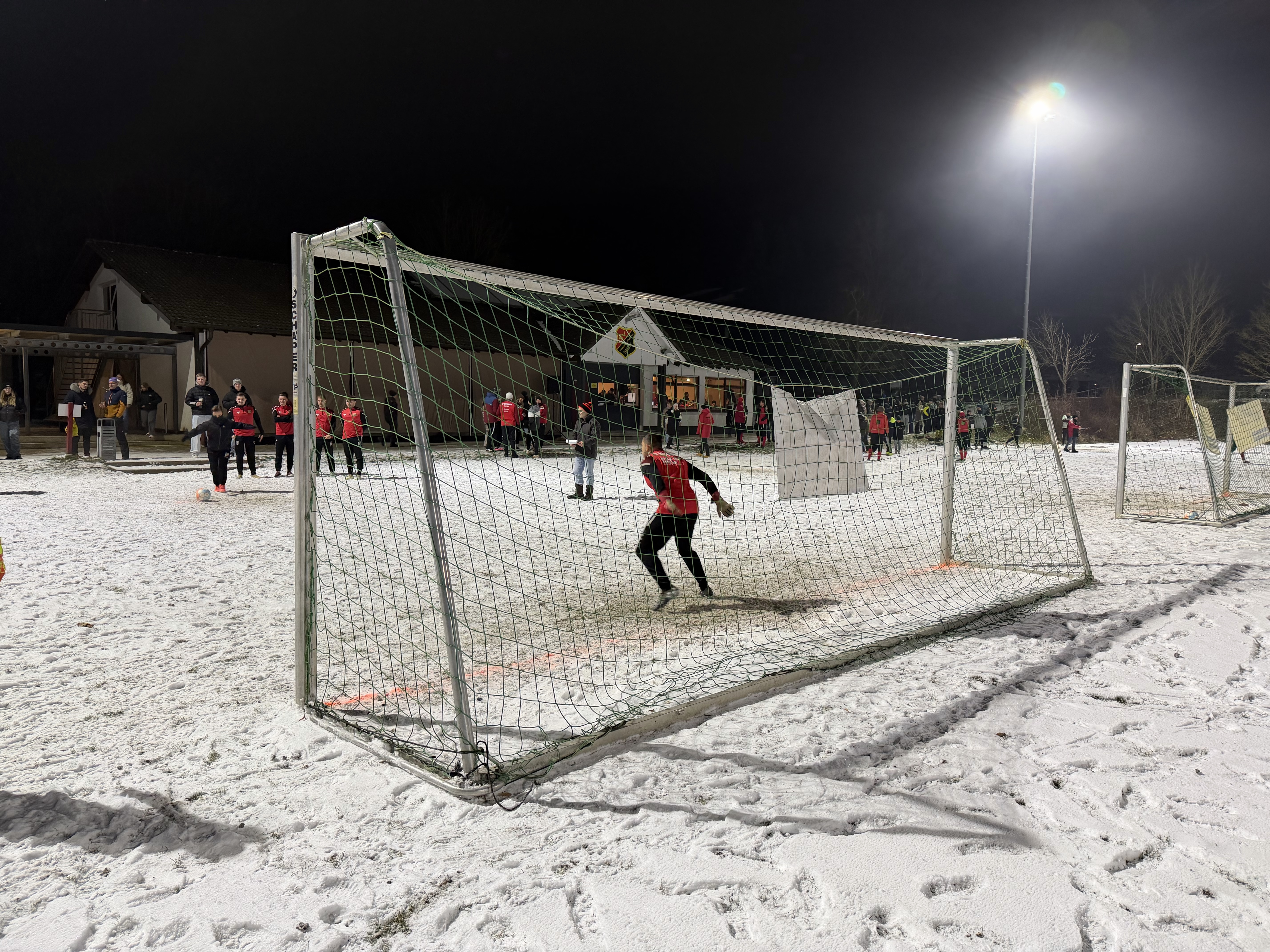 Vor dem Sportheim standen vier Tore bereit. Schnee und gefrorener Boden sorgten für perfekte Bedingungen, sehr zur Freude des Platzteams um Karl-Heinz Baumeister. Auch das Aufräumen geht bei solchen Bedingungen deutlich leichter von der Hand. Zudem konnten wieder vier Torsponsoren gewonnen werden, die für jedes erzielte Tor 5 Euro spendeten: