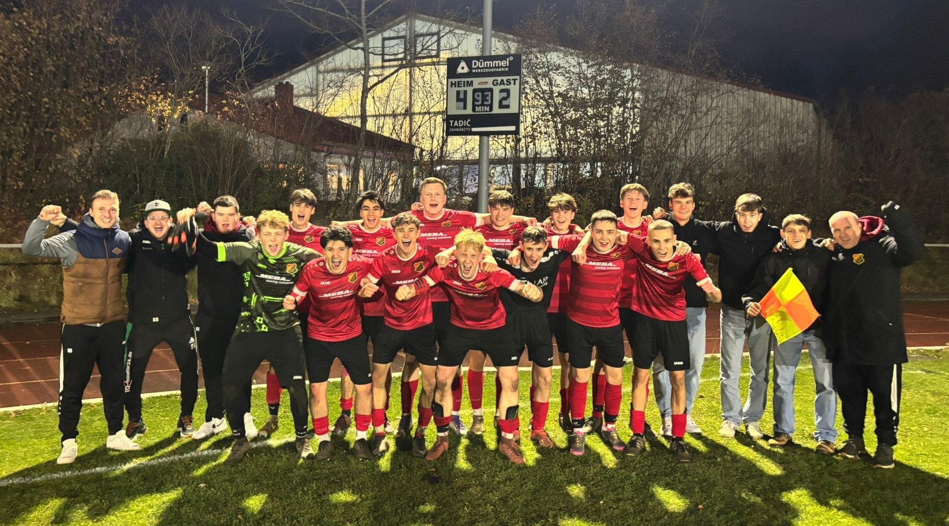 (Markus) Am Donnerstag, den 06.11.2025, bestritt die D1 ihr letztes Heimspiel der Saison gegen den ESC Ulm. Der Kader war vollständig, sodass die Trainer auf genügend Auswechselspieler zurückgreifen konnten. Die SVW-Jungs starteten hochmotiviert und setzten den Gegner von Beginn an unter Druck. Schon früh ergaben sich gute Chancen, und so mussten die Fans nicht lange warten: Nach einem schön herausgespielten Angriff erzielte Arne das verdiente 1:0. Direkt nach dem Anstoß eroberte der SVW den Ball erneut in der gegnerischen Hälfte. Ein Schuss im Strafraum traf den Arm eines Ulmer Spielers – den fälligen Strafstoß verwandelte Arne sicher zum 2:0. Unsere Abwehr stand stabil und ließ nur wenige Chancen zu. Nach einem Freistoß des Gegners verschätzte sich unser Torhüter beim Herauslaufen – diese Gelegenheit nutzte der ESC Ulm zum 2:1-Anschlusstreffer. Beflügelt vom Tor drängte Ulm auf den Ausgleich, doch unsere Abwehr hielt stark dagegen. Im Aufbauspiel wurde der SVW jedoch immer wieder durch Fouls gestoppt. Kurz vor der Pause erzielte Ulm nach einem Freistoß schließlich noch den 2:2-Halbzeitstand.