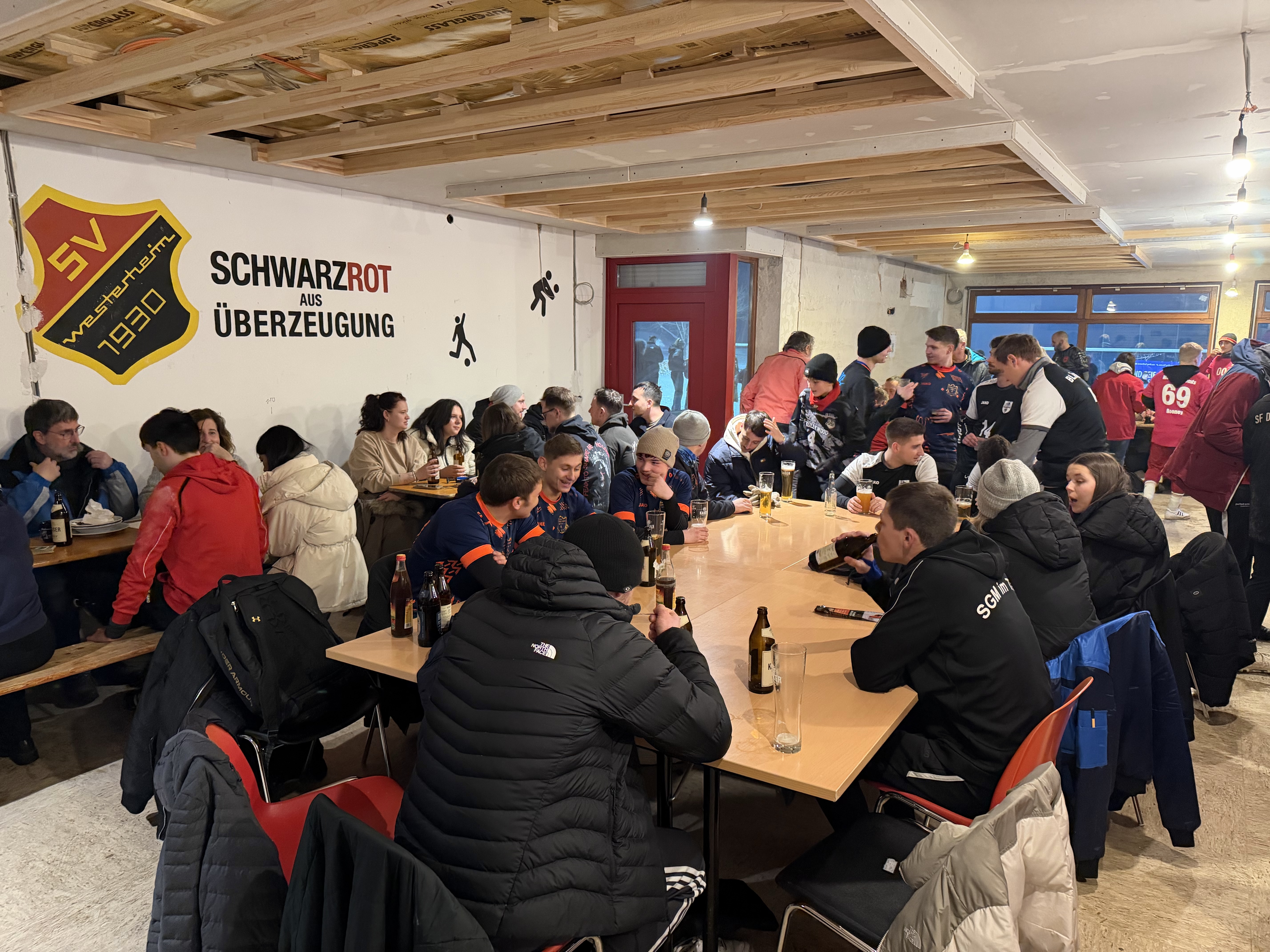 Das Sportheim befindet sich aktuell mitten im Umbau, doch dank zahlreicher zusätzlicher Arbeitsdienste konnte der Gastraum in einen passenden Rahmen verwandelt werden. Der Rohbau ist fast abgeschlossen, und mit Baulampen war für ausreichend Licht gesorgt.